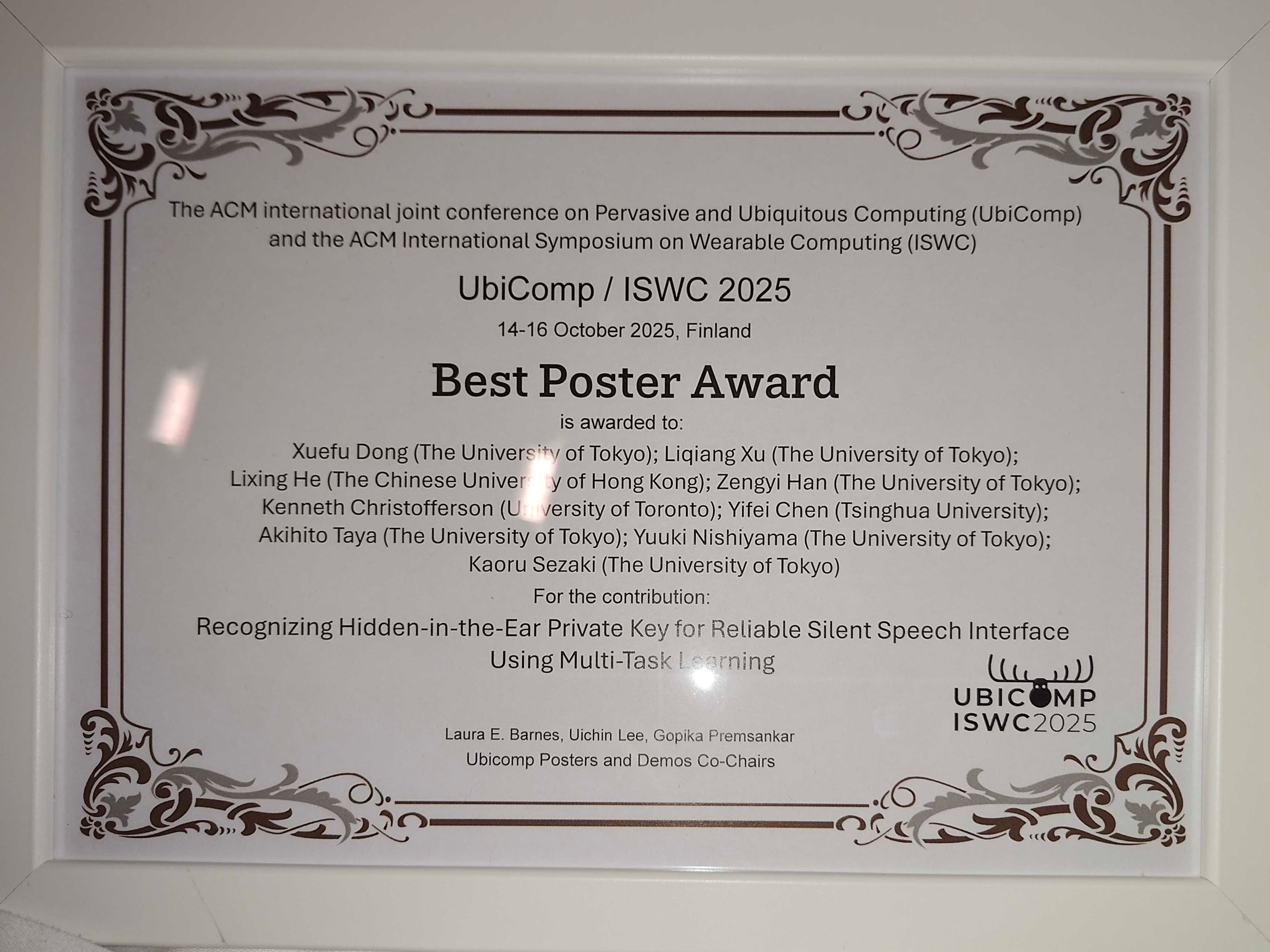- ACM UbiComp 2025 [Poster: Recognizing Hidden-in-the-Ear Private Key for Reliable Silent Speech Interface Using Multi-Task Learning, 2025 ACM international joint conference on Pervasive and Ubiquitous Computing (UbiComp). ACM, 2025], Xuefu Dong, Liqiang Xu, Lixing He, Zengyi Han*, Kenneth Christofferson, Yifei Chen, Akihito Taya, Yuuki Nishiyama, Kaoru Sezaki. Poster Presentation in Espoo, Finland. Best Poster Award
